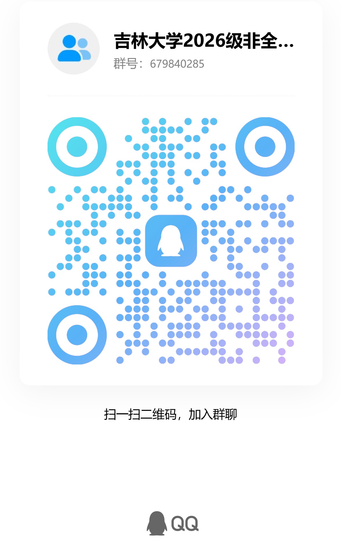 为了方便2026级非全日制MBA拟录取考生做好入学前的信息确认等准备工作,与入学后及时有效的接收到各类通知等。吉林大学MBA教育中心招生工作办公室创建了“吉林大学2026级非全MBA”QQ群,群号:679840285。请已经在网站公示拟录取名单的同学加入此群,申请入群请标注好信息即本人姓名与身份证号后4位,如:张三-1234。我们会严格按照拟录取名单对比信息,谢绝无关人员的入群申请。