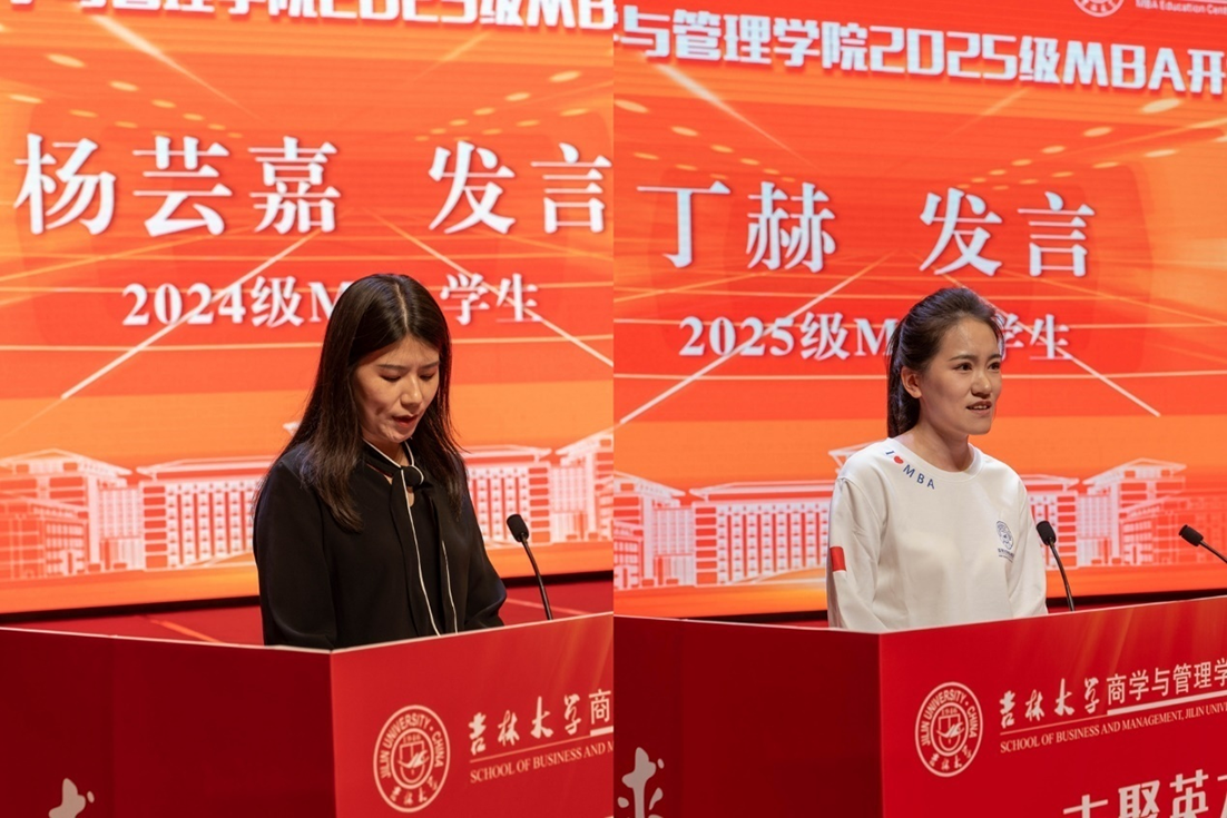 在校生代表24级MBA杨芸嘉与新生代表2025级MBA丁赫依次发言,传递传承与展望之声。
