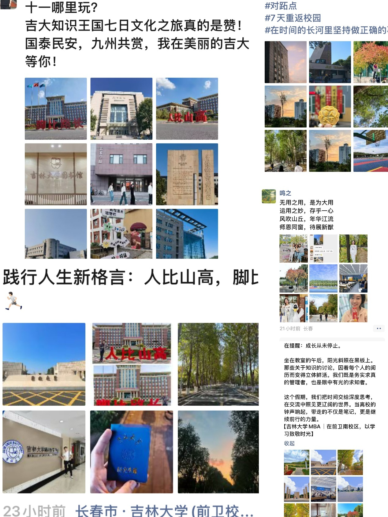 P7班江山当国庆的红旗漫卷过长春的街道,北国春城正用中秋时澄澈的蓝天,给我们的吉大研究生生活,写就了一段从“陌生”到“亲近”的过渡,把七天的在校时间过成了读懂吉大、爱上长春的契机。这七天里,学院中心准备了丰富的课程和活动,忙碌的我们像是重新回到了青春校园的时光。直到离开前一天站在校园里看夜景,远处的路灯连成一片暖光,忽然懂得,研究生的十一假期不是用来“逃离”,而是用来“扎根”——在鼎新讲堂的开学仪式里,扎下对学术的敬畏;在逸夫楼与同窗学习的时光里,扎下与吉大最深的感情;在“北国春城”的温柔里,扎下对这座城市的喜爱。